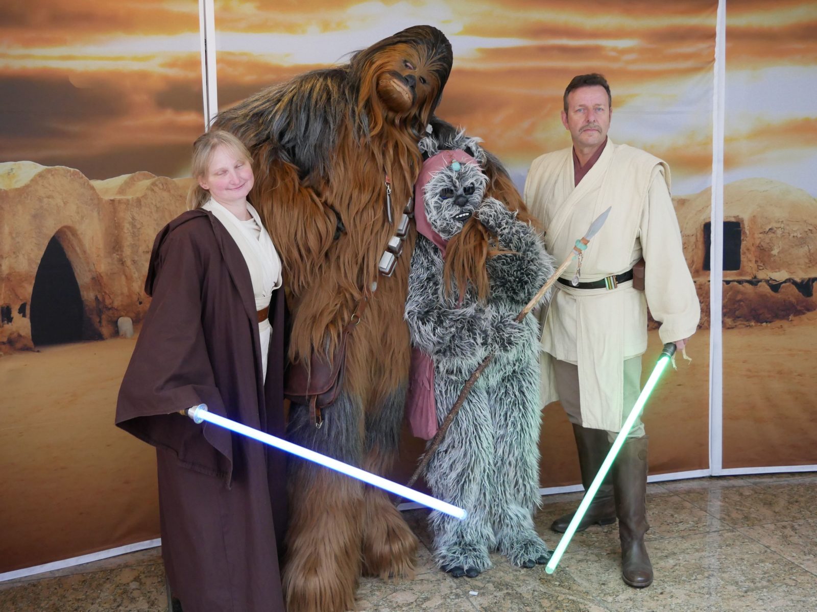 Am Con-Freitag ging es voller Vorfreude und Aufregung los. Neben unseren Freunden der 501st Legion – German Garrison hatten wir unseren Stand mit Tatooine-Fotowand und Schaufensterpuppe mit Jedi-Outfit aufgebaut, um die Besucher begrüßen, informieren und bespaßen zu können.
